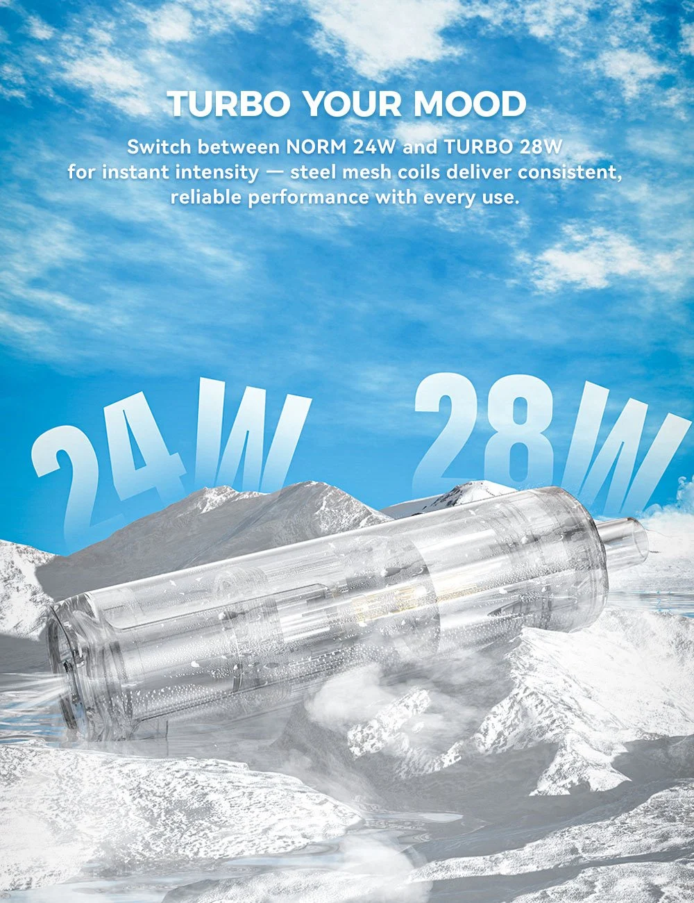 With dual power modes (24W / 28W) and a 25ml internal capacity, the AirRush delivers up to 20,000 puffs of consistent output. The steel mesh coil enhances airflow and stability, creating a smooth, clean draw with a crisp finish.